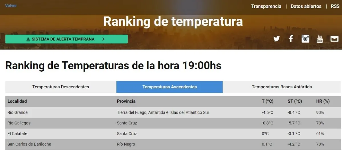 En este contexto, vale destacar que en el ranking de temperaturas ascendentes publicado a las 19 horas por el Servicio Meteorológico Nacional, Bariloche se ubicó en el cuarto lugar, con 0.1°C y una sensación térmica de -4.2°C, siendo superada solamente por El Calafate, Río Gallegos y Río Grande.