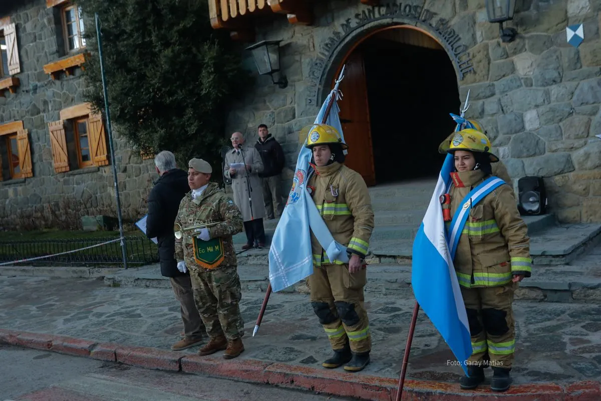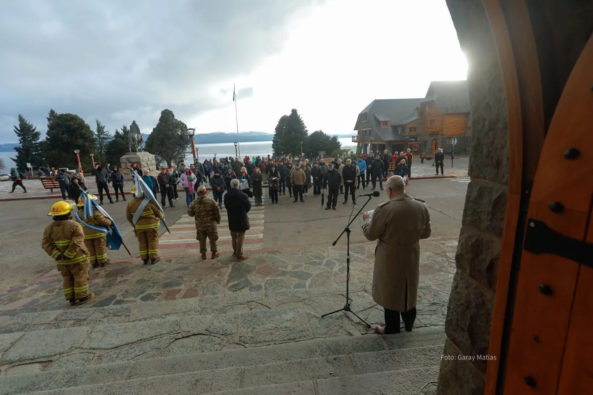 La bandera ceremonial, en tanto, fue portada por bomberos voluntarios de Cerro Campanario, y un miembro de la Escuela Militar de Montaña “Tte. Gral. Juan Domingo Perón” se encargó, con su trompeta, del toque de diana de gloria en honor a Roca.