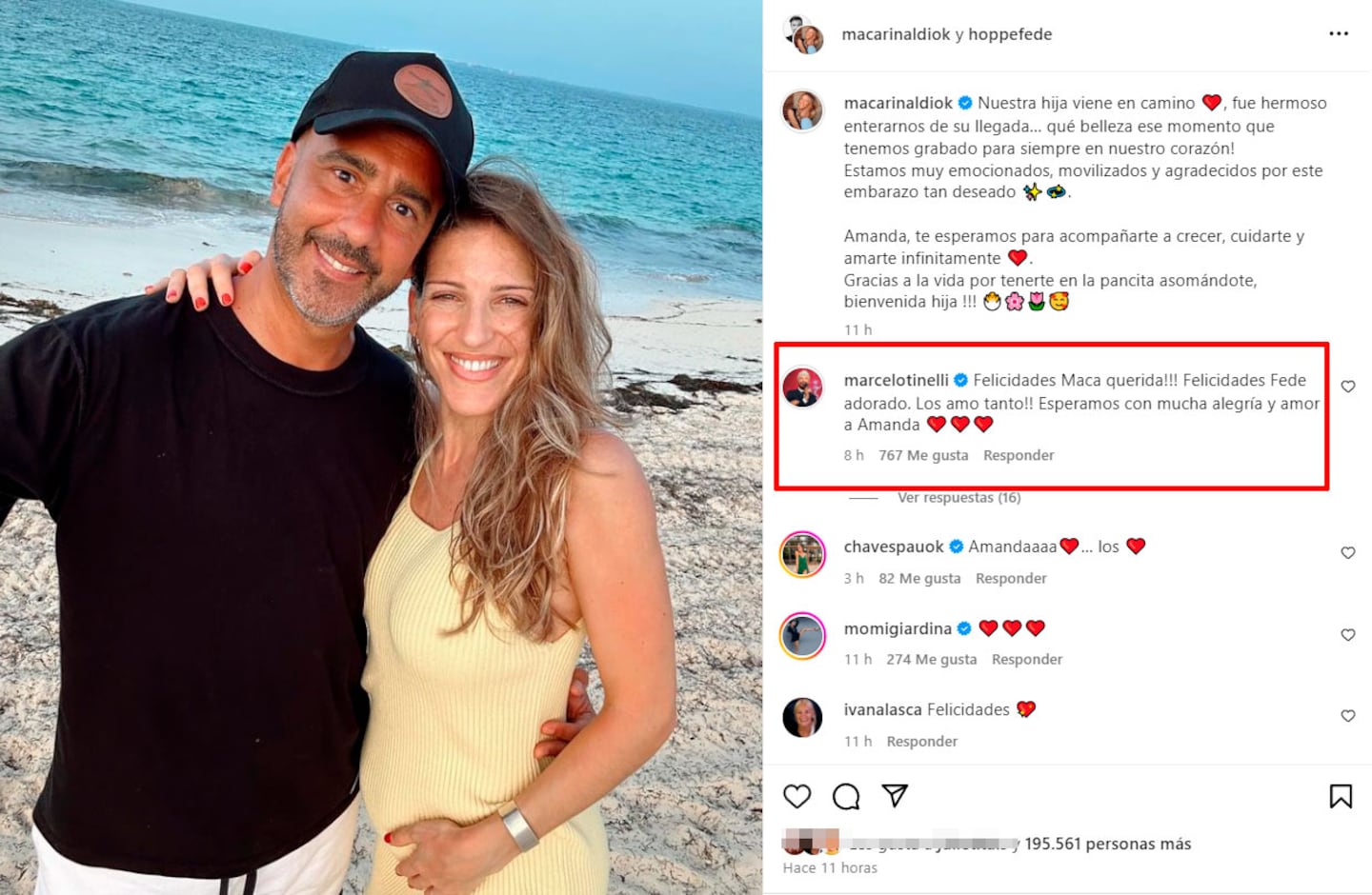 Otro de los que se hizo eco de la noticia y no pasó desapercibido fue Marcelo Tinelli, con quien se rumoreó que hubo peleas hace algunos meses. Sin embargo, el conductor se mostró muy alegre con esta confirmación: “¡¡¡Felicidades, Maca querida!!! Felicidades, Fede, adorado. ¡¡¡ Los amo tanto!!! Esperamos con mucha alegría y amor a Amanda”.