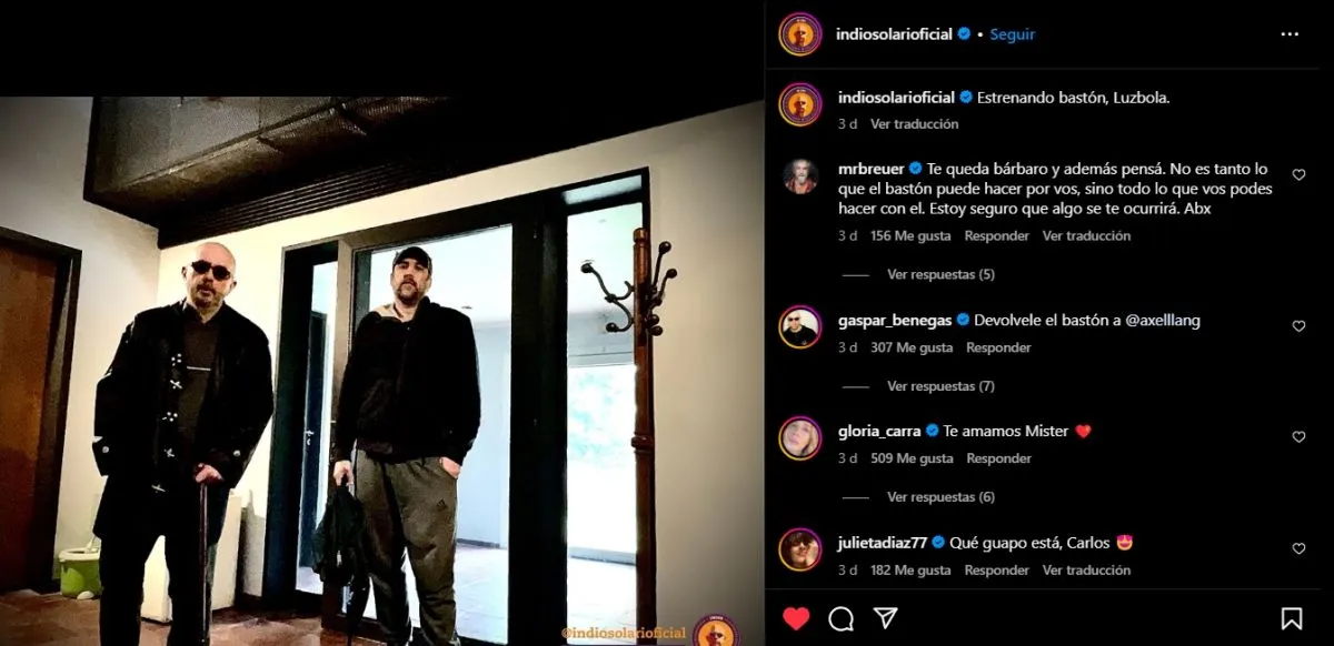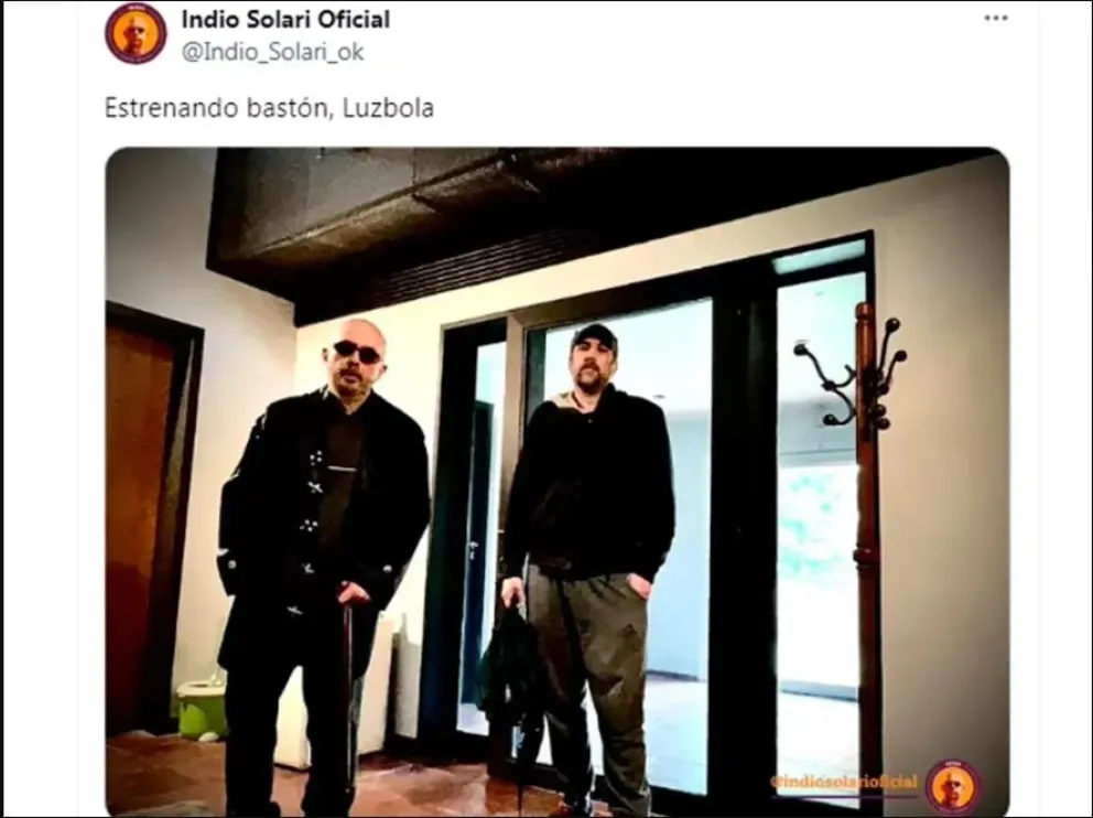 Se debe a que el Indio Solari posó para la cámara con sus característicos anteojos, un abrigo de color negro, y en su mano izquierda un bastón, en el cual se encuentra apoyado. "Estrenando bastón, Luzbola", escribió junto a la foto el cantante.