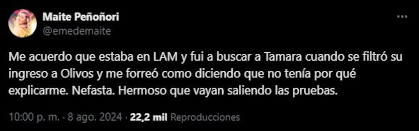 A través de sus redes sociales, Maite expuso un descargo sobre aquel tenso momento: “Me acuerdo que estaba en LAM y fui a buscar a Tamara cuando se filtró su ingreso a Olivos y me forreó como diciendo que no tenía por qué explicarme”, comenzó explicando.