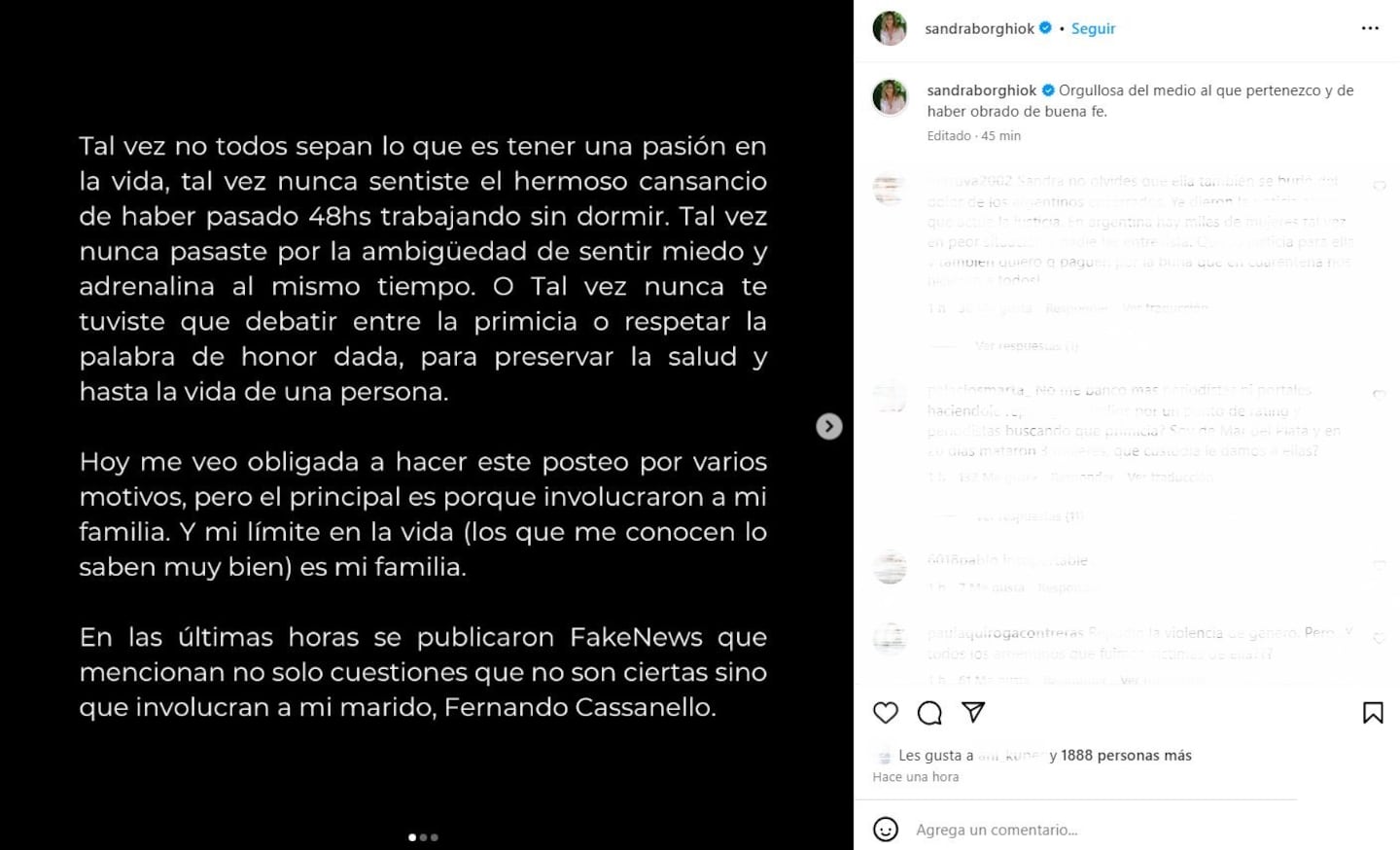 De este modo, reveló cuál era la razón por la que lanzaba este comunicado: “Hoy me veo obligada a hacer este posteo por varios motivos, pero el principal es porque involucraron a mi familia. Y mi límite en la vida (los que me conocen, lo saben muy bien) es mi familia. En las últimas horas se publicaron fake news que mencionan, no solo cuestiones que no son ciertas, sino que involucran a mi marido Fernando Cassanello”.