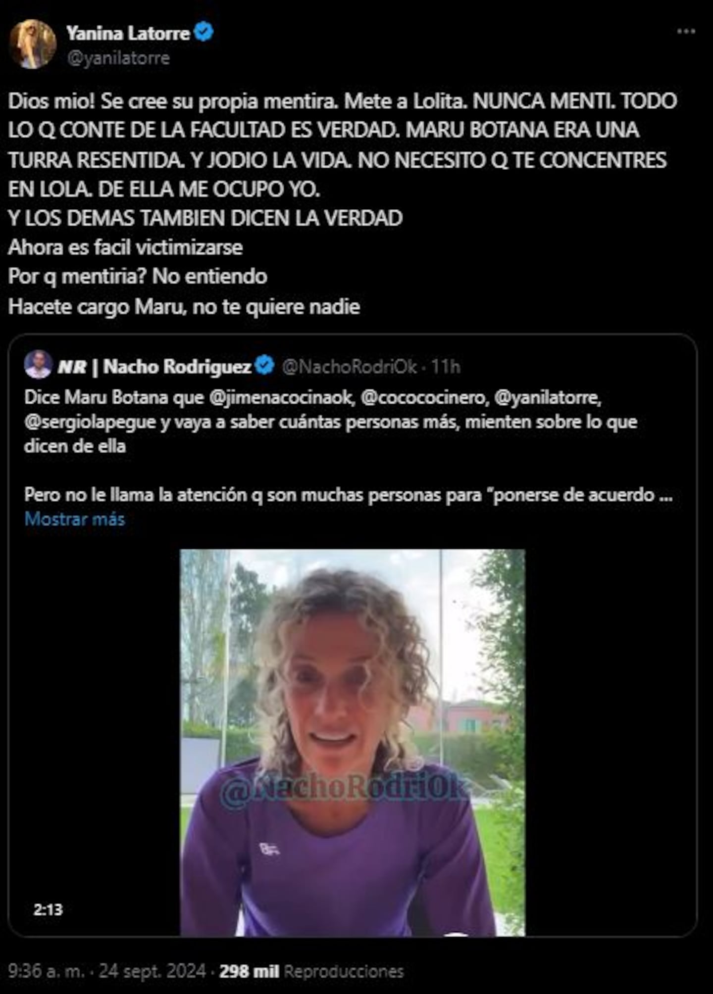 Hacete cargo, Maru, no te quiere nadie”, cerró muy picante Yanina Latorre contra la cocinera, no sólo por la desmentida en su video, sino que también la panelista expuso que tiene bronca con ella desde aquellos días en los que eran compañeras de facultad.