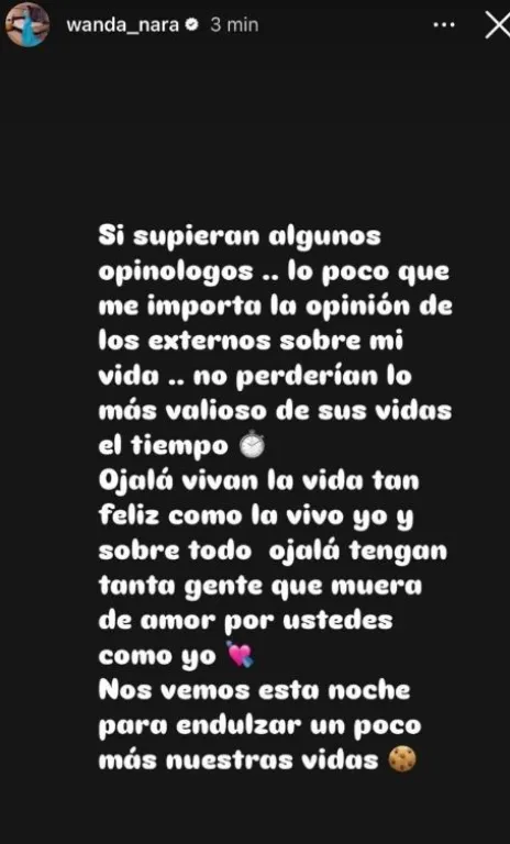 Para aquellos críticos que se apresuran a emitir juicios sin saber la verdad completa: les deseo una felicidad comparable a la que siento al vivir mi vida”, expresó Nara en un claramente desafiante mensaje, dejando claro que no daría cabida a la negatividad ni permitiría que opiniones apresuradas influyan en su vida diaria. Este tipo de respuestas firmes ha caracterizado a Wanda a lo largo de su carrera pública, mostrando un carácter resiliente.