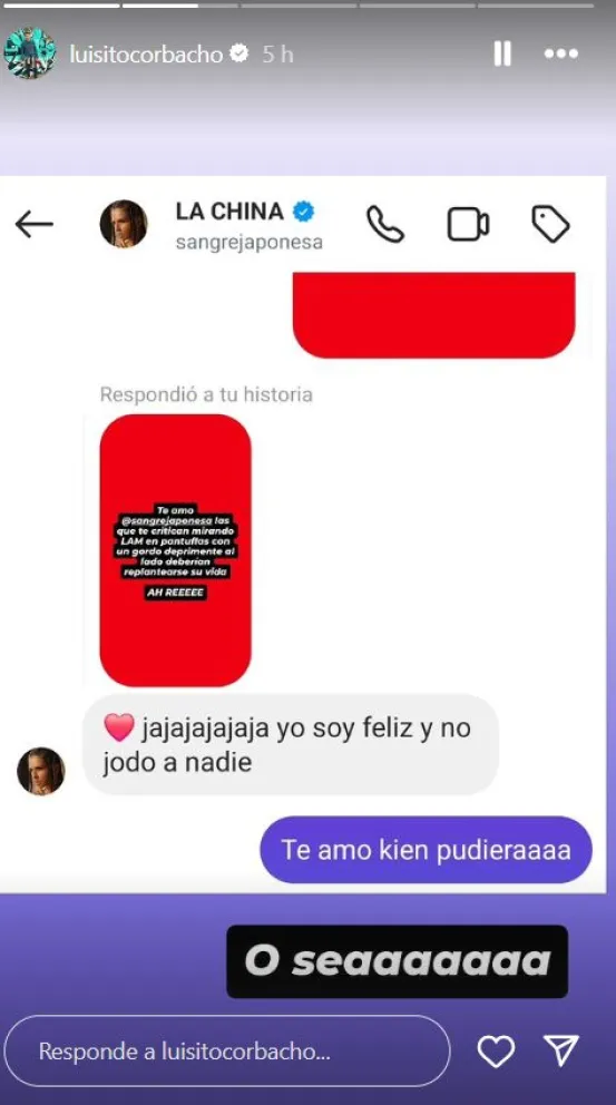 A través de sus historias de Instagram, Corbacho expresó su afecto a la actriz, describiendo con ironía a quienes la detractan. En un tono jocoso, destacó la alegría que ve en su amiga y sugirió que tal vez quienes la critican deberían reconsiderar sus propias vidas. Por su parte, la China respondió de manera natural y desenfada, restándole importancia a las críticas.