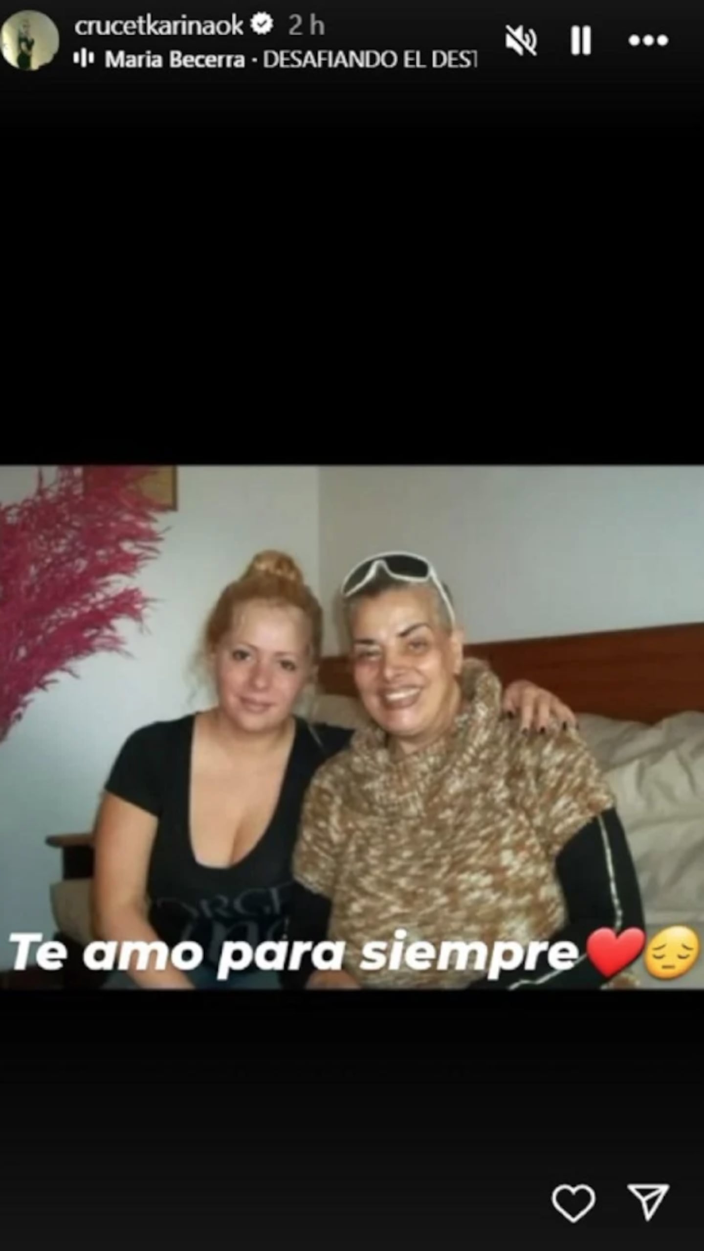 De este modo, la propia Karina Crucet fue quien inició con los mensajes de dolor y despedida para su madre. Es que compartió una foto en su feed en la cual escribió: “Te amo para siempre”. Para darle un tinte emotivo, eligió la canción de María Becerra “Desafiando el destino”.