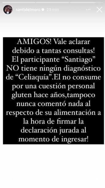 “Amigos! Vale aclarar, debido a tantas consultas! El participante Santiago no tiene ningún diagnóstico de Celiaquía”, comenzó diciendo. Tras deschavar su mentira, aclaró que sólo se trata de una decisión personal: “Él no consume por una cuestión personal gluten hace años, tampoco nunca comentó nada al respecto de su alimentación a la hora de firmar la declaración jurada al momento de ingresar!”