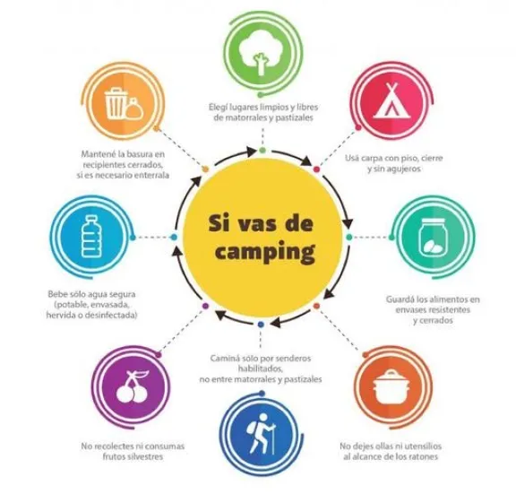 Siempre se debe acampar en lugares habilitados, limpios y alejados de matorrales y pastizales. Se debe utilizar carpa con piso, cierre y sin agujeros para evitar el contacto con los roedores.