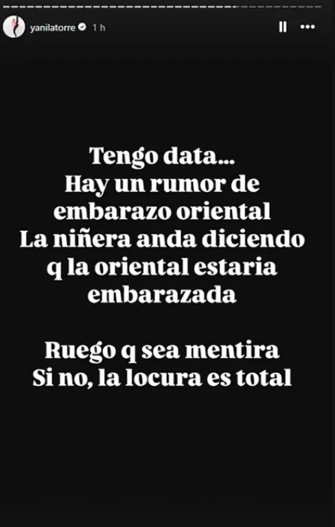 "Tengo data... Hay un rumor de embarazo oriental. La niñera anda diciendo que la oriental estaría embarazada", expresó la panelista de LAM respecto a la información bomba que le llegó.