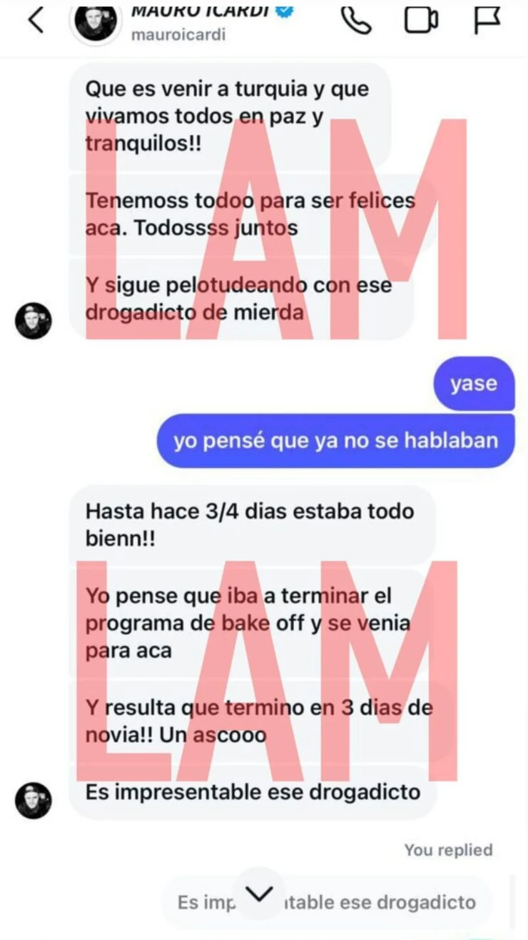 Es que en estos mensajes se puede ver cómo Mauro Icardi intenta influencer al joven Valentino López de 16 para que ataque a su madre y no deje entrar a L-Gante a su casa. Es por eso que lo incentivaba a vivir todos en Turquía nuevamente: “Tenemos todo para ser felices acá y sigue pelotudeando con ese drogadicto de mierda”.
