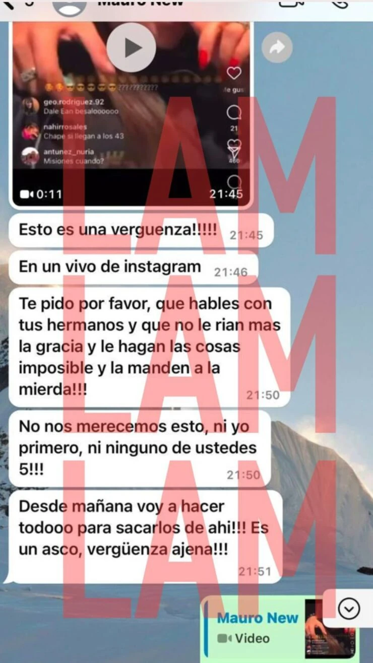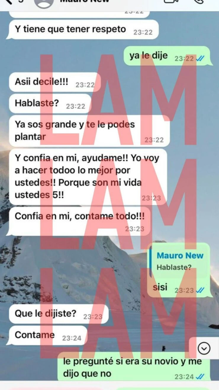 Además, en uno de los mensajes se refirió a L-Gante como “ese negro de mierda”. E incluso le llegó a pedir que lo enfrente ante su madre para no dejarlo entrar a su casa: “¡Y se lo decís a mamá en frente de él! Que a nuestra casa no entra, porque es la casa de Mauro”. “Sos grande y te podés plantar. Confiá en mí, ayúdame, contame todo”.