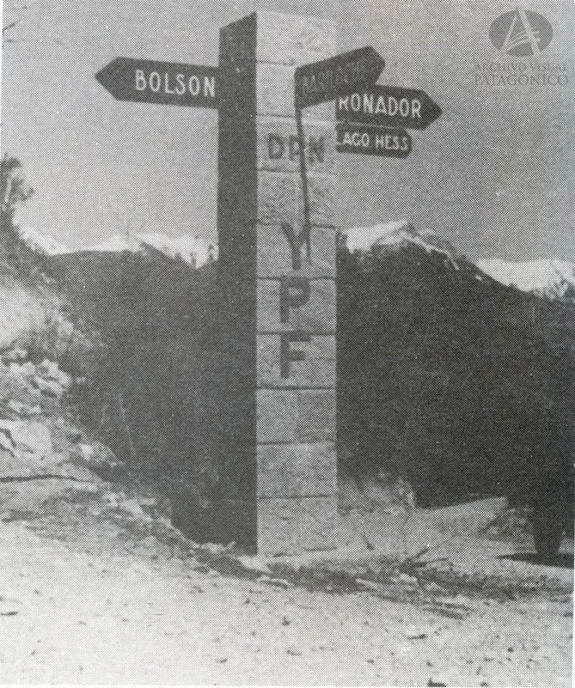 El indicador de caminos al lado de la Intendencia del PNNH. 1940. Archivo Visual Patagónico.