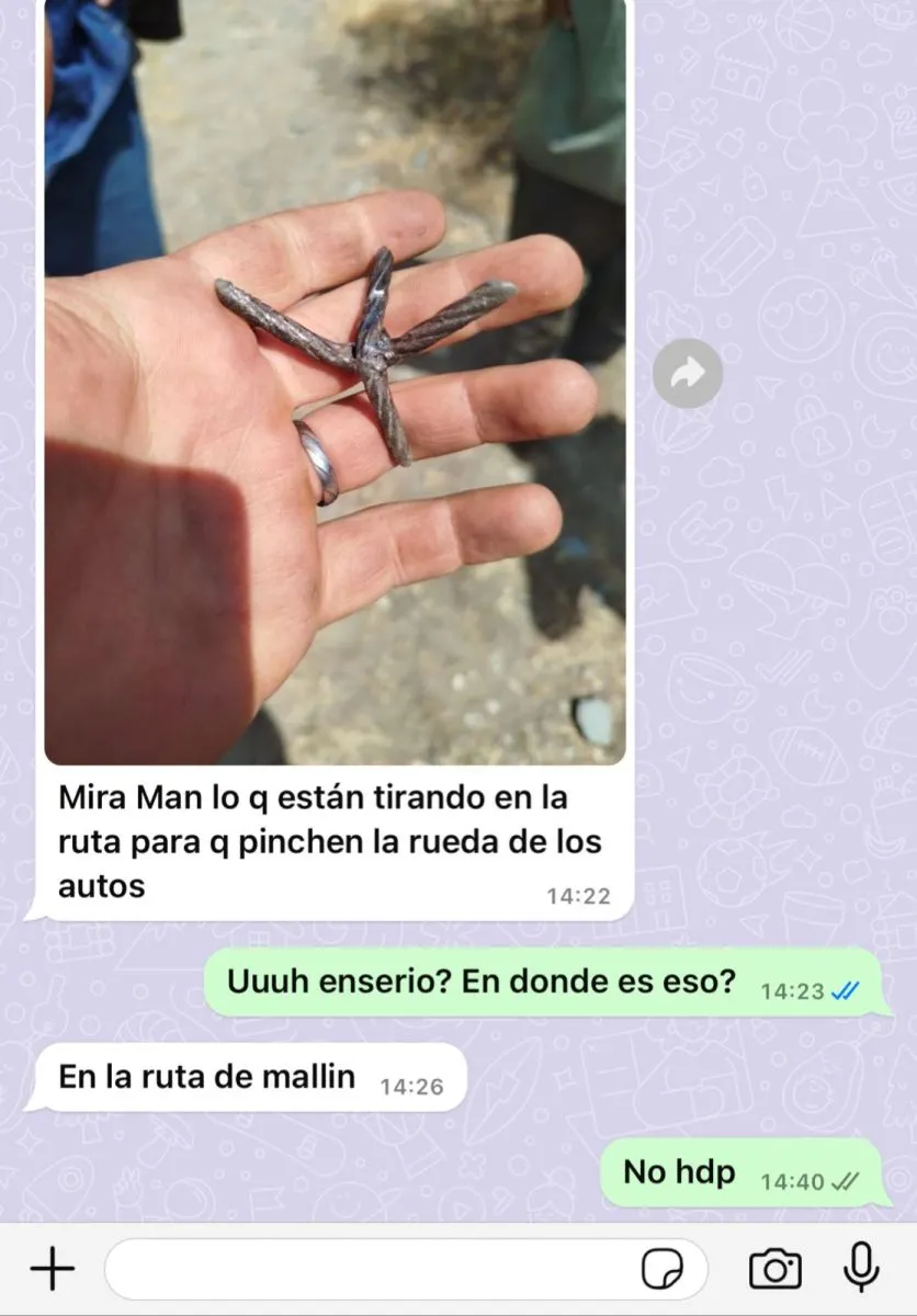 En este marco, un vecino de Bariloche envió a la redacción de El Cordillerano las imágenes del bidón y elementos (comúnmente denominados "miguelitos") utilizados para que los vehículos que ingresan a la Ruta 86 de acceso a Mallín Ahogado, pinchen cubiertas.