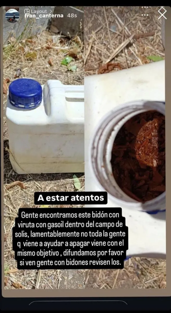"Queremos advertir a los vecinos que no todos los que llegan con bidones van con buenas intenciones, este tenía aserrín y combustible para que arda con el fuego" expresó el vecino que prefirió no dar su nombre. El mismo gobernador de la provincia confirmó que el recipiente existe y ya fue entregado a la Policía.
