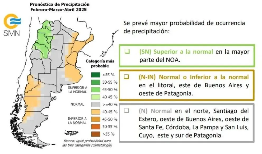 Además, en el resto del país, la falta de lluvias también afectará a la región de la mesopotamia y en el norte bonaerense. En el noroeste se espera un 45-50% más de agua que lo normal para esta parte del año.