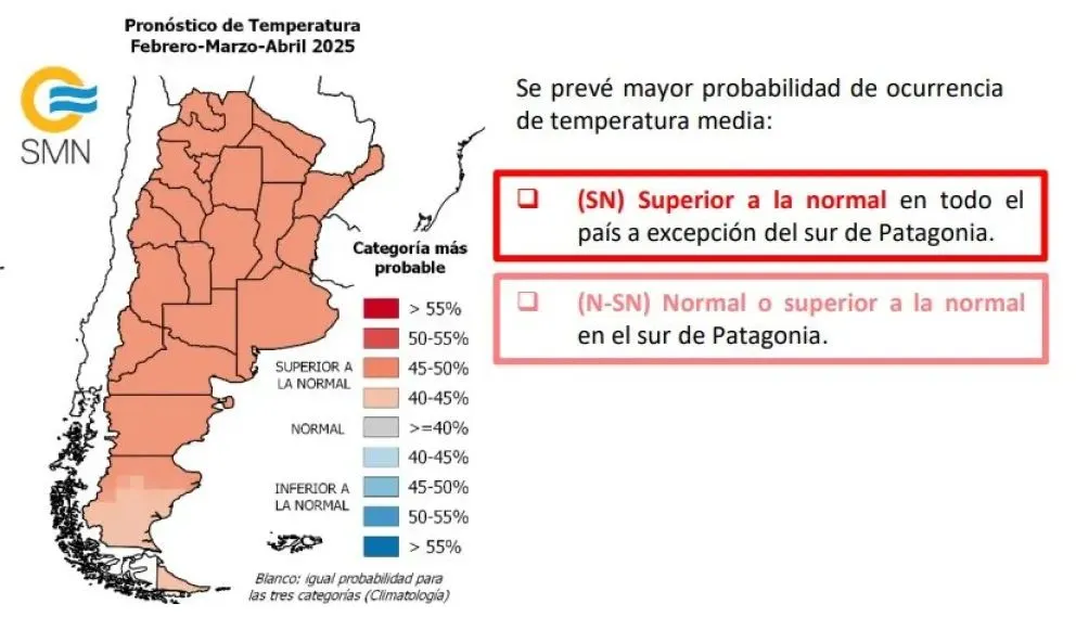 Por el lado de las temperaturas, el SMN indicó que prácticamente en todo el país el promedio de temperaturas estará muy por encima de los niveles normales, desde Jujuy hasta parte de Santa Cruz. En Río Negro, los termómetros alcanzarán entre 45 y 50% más de temperatura que los parámetros normales para esta época del año en esta región del país.
