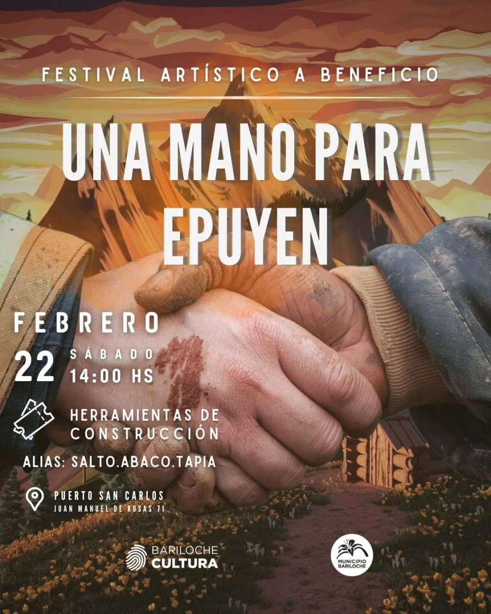 Sensibles ante la tragedia que vivió la vecina localidad chubutense, músicos y otros artistas de Bariloche convocan a participar del festival artístico a beneficio “Una mano para Epuyén”. El acontecimiento tendrá lugar en Puerto San Carlos el próximo 22 de febrero y la intención es que se sumen cultores de varias disciplinas, además de la música. Con respaldo de la Municipalidad, la iniciativa corre por cuenta de Maximiliano Ricchetti (El Gordo Elvis); Pepe Jiménez y Marcelo Salcedo (Sam Coustom).