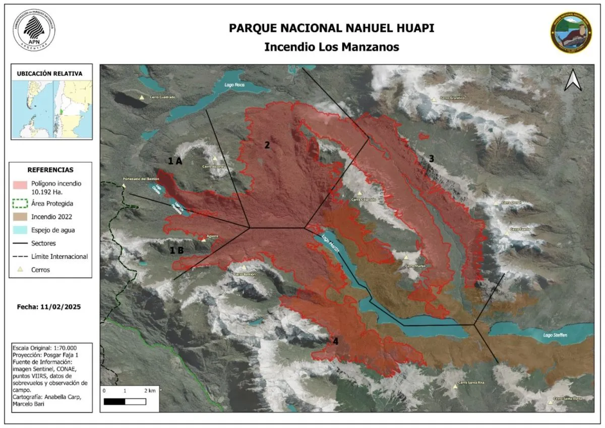 El incendio en la zona de Los Manzanos, dentro del Parque Nacional Nahuel Huapi, sigue activo y ya ha consumido más de 10 mil hectáreas. Según informó el Comité de Emergencia, coordinado por el Parque Nacional y la Dirección de Lucha Contra Incendios Forestales y Emergencias, las llamas continúan avanzando en dos sectores principales: Lago Roca-Hess y El Manso.