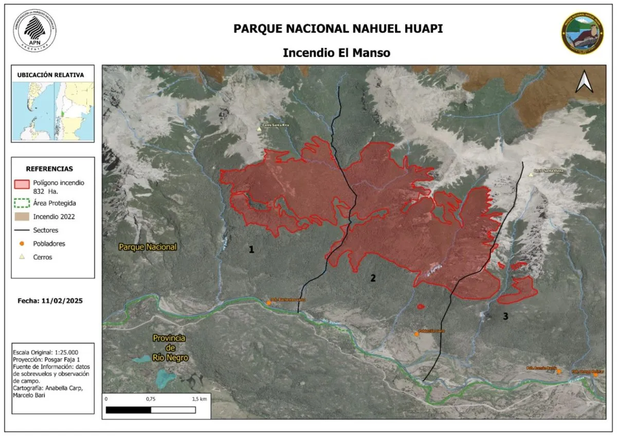 La evaluación actualizada de la superficie afectada indica que el sector Los Manzanos registra 10.192 hectáreas quemadas, mientras que en El Manso la cifra asciende a 832 hectáreas. En la lucha contra el fuego trabajan actualmente 295 personas, de las cuales 137 están en ataque directo, incluyendo brigadistas, guardaparques y pobladores. Otras 158 personas colaboran con tareas logísticas y de asistencia en los campamentos.