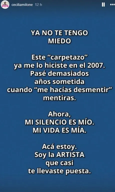 Cecilia manifestó su disgusto mediante un mensaje de corte enigmático, lanzado desde sus redes personales, aseverando: "Ya no te tengo miedo. Este carpetazo ya me lo hiciste en 2007. Pasé demasiados años sometida cuando me hacías desmentir mentiras. Ahora mi silencio es mío. Mi vida es mía", disaparó.