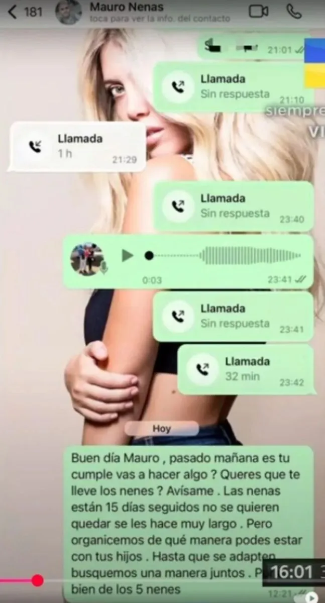 Guido Záffora mostró en Intrusos una captura de pantalla de un mensaje que la empresaria le envió al futbolista, tratando de acordar una solución. “Buen día, Mauro. Pasado mañana es tu cumple. ¿Vas a hacer algo? ¿Querés que te lleve a las nenas? Avisame… Las nenas 15 días seguidos no se quieren quedar, se les hace muy largo. Pero organicemos de qué manera podés estar con tus hijos. Hasta que se adapten, busquemos una manera juntos. Por el bien de los cinco nenes”, escribió ella.