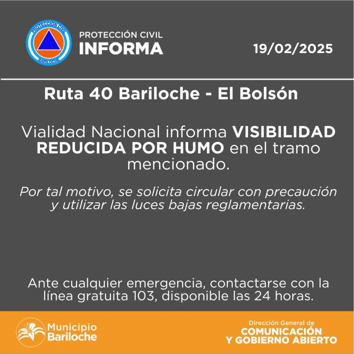 Vialidad Nacional informó este miércoles al mediodía que la Ruta Nacional 40 presenta visibilidad reducida debido a la presencia de humo en el tramo que va desde la zona de Mascardi hasta El Bolsón.