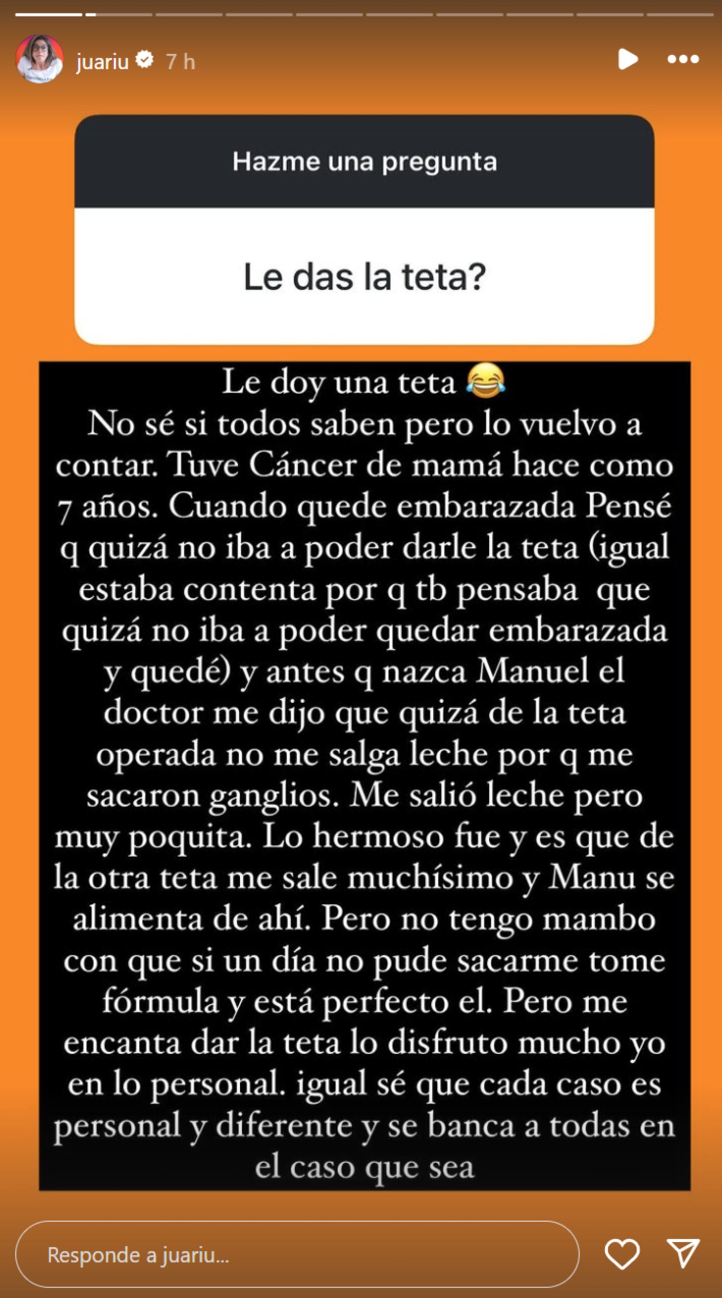 Por lo pronto, reveló algunos detalles de cómo transita la maternidad, por lo que contó cómo vivió el hecho de amamantar luego de padecer cáncer de mama: “Le doy una teta (emoji que llora de la risa). No sé si todos saben, pero lo vuelvo a contar. Tuve cáncer de mama hace como siete años y cuando quedé embarazada pensé que no iba a poder darle la teta (igual, estaba contenta porque también pensaba que quizá no iba a poder quedar embarazada y quedé)”.