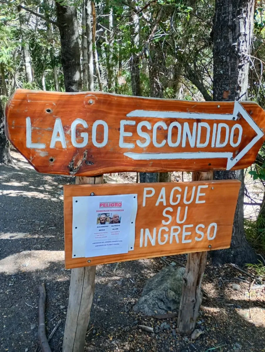 Uno cartel apuntando contra Seguí y Allen, colocado sobre una señal de lago Escondido.