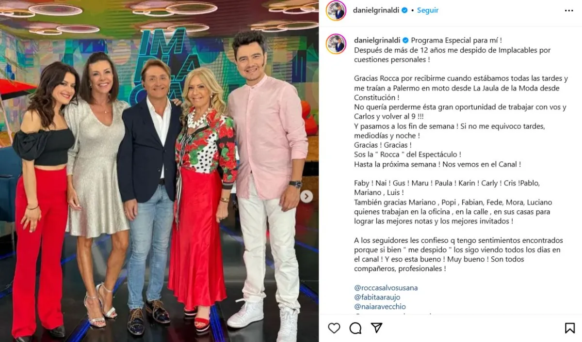 Después de una larga trayectoria de 12 años, el periodista y panelista icónico Daniel Gómez Rinaldi decidió cerrar un capítulo importante en su vida profesional al retirarse de "Implacables", el programa de espectáculos emitido por El Nueve. Susana Roccasalvo, la carismática conductora del show, honró la ocasión con una emotiva despedida que resonó profundamente tanto entre el equipo como en la audiencia.