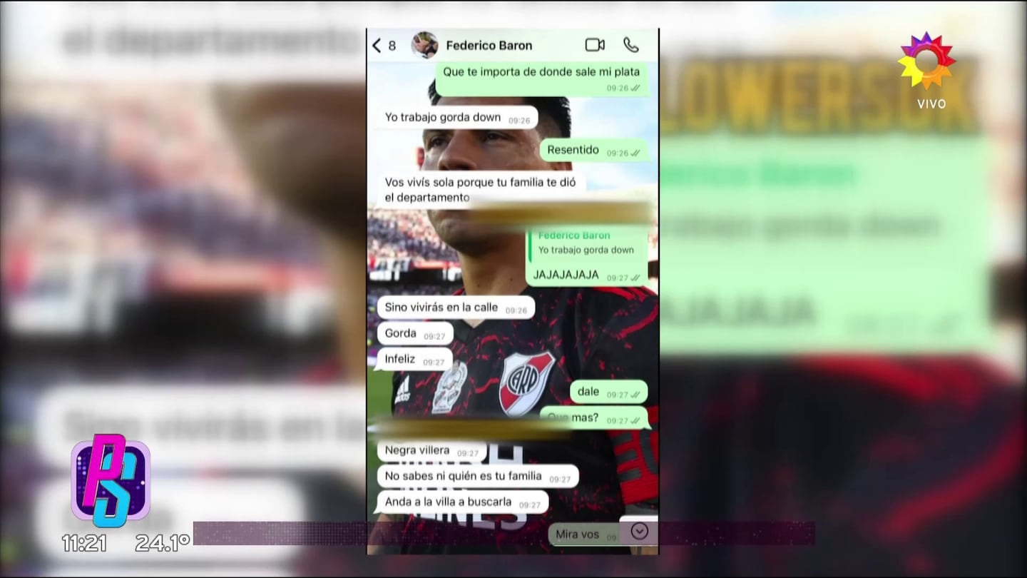 En los primeros mensajes se puede ver la conversación entre Nara Zubieta y Federico Barón, por lo que ella le dice: “Qué te importa de dónde sale mi plata”. A lo que él comienza a responder en tono polémico: “Yo trabajo gorda down”. Y ella, sin insultar, tiró: “Resentido”.
