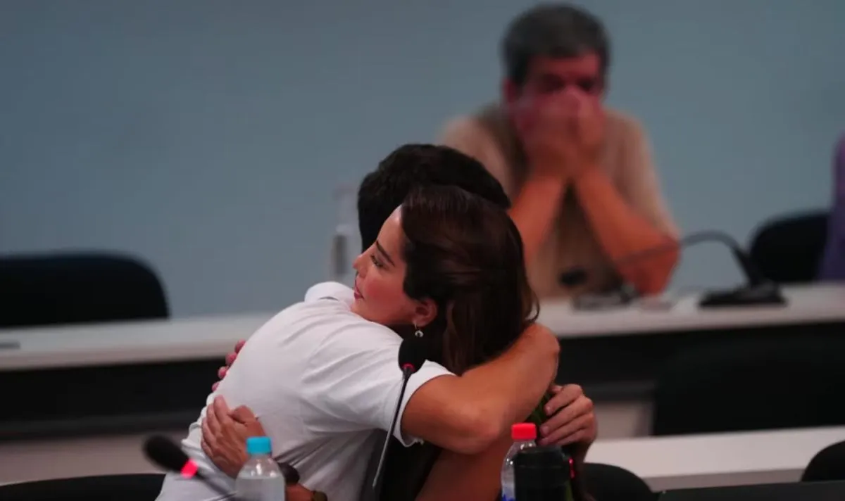 Néstor Soto y su abogada en pleno juicio, intercambian sonrisas y abrazos.(El Doce TV)
