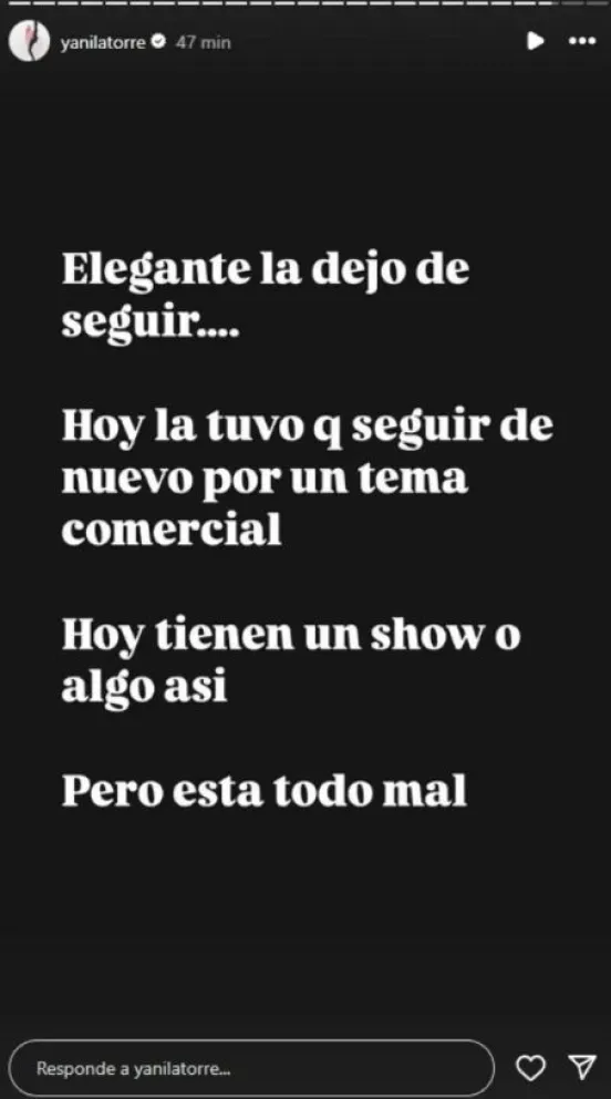 “L-Gante la dejó de seguir... hoy la tuvo que seguir de nuevo por un tema comercial. Hoy tienen un show o algo así, pero está todo mal” aseguró la panelista para dejar en claro que no le ve futuro a este romance y que incluso ella ya logró dar vuelta la página.