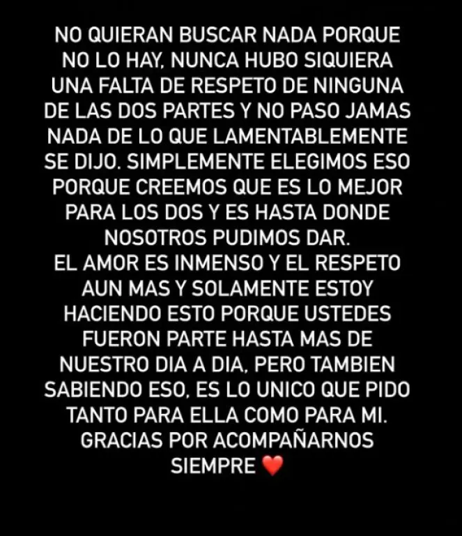 “Solamente estoy haciendo esto porque ustedes fueron parte hasta más de nuestro día a día, pero también sabiendo eso es lo único que pudo para ella como para mí”, agregó. Con estas palabras, quiso expresar que su decisión no solo los afectó a ellos, sino también a aquellos que los seguían constantemente.