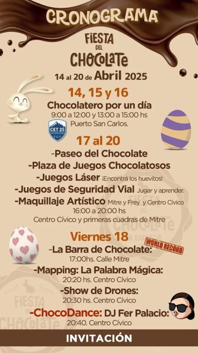 La Fiesta del Chocolate es un evento organizado por la Municipalidad junto a la Cámara de Chocolateros que convoca a una multitud de residentes y turistas deseosos de disfrutar una Pascua inolvidable con la gran cantidad de actividades programadas, entre las que se destaca la creación de la Barra de chocolate más larga del mundo, a partir de las 17 horas de este viernes 18 de abril.