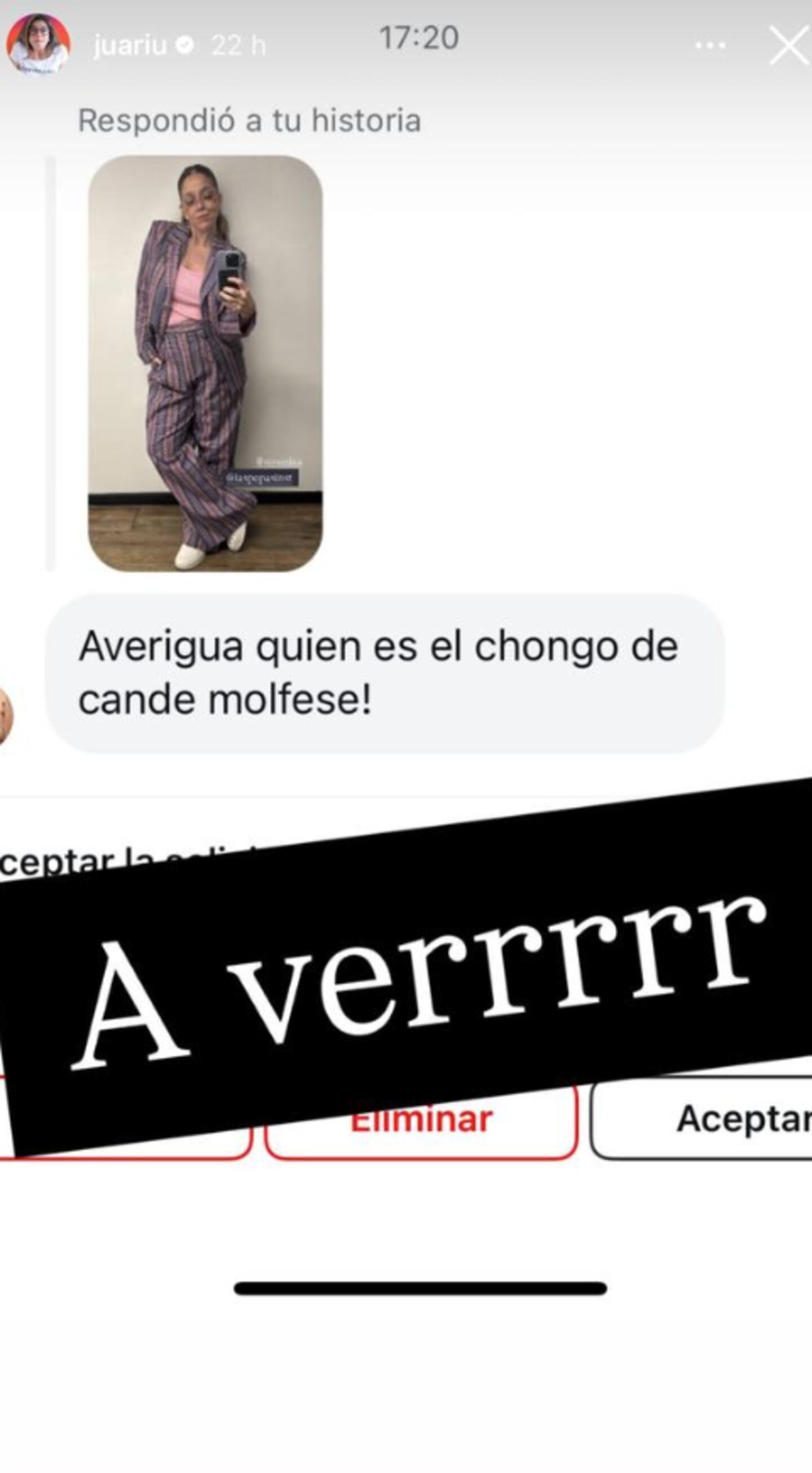“Averiguá quién es el nuevo chongo de Cande Molfese”, le exigieron a la periodista que suele deschavar a los famosos. Lejos de achicarse se dispuso a investigar: “A ver”. En una de las fotos que analizó se la pudo ver posando frente a un vidrio y en el reflejo aparece un hombre, que sería su nuevo novio.