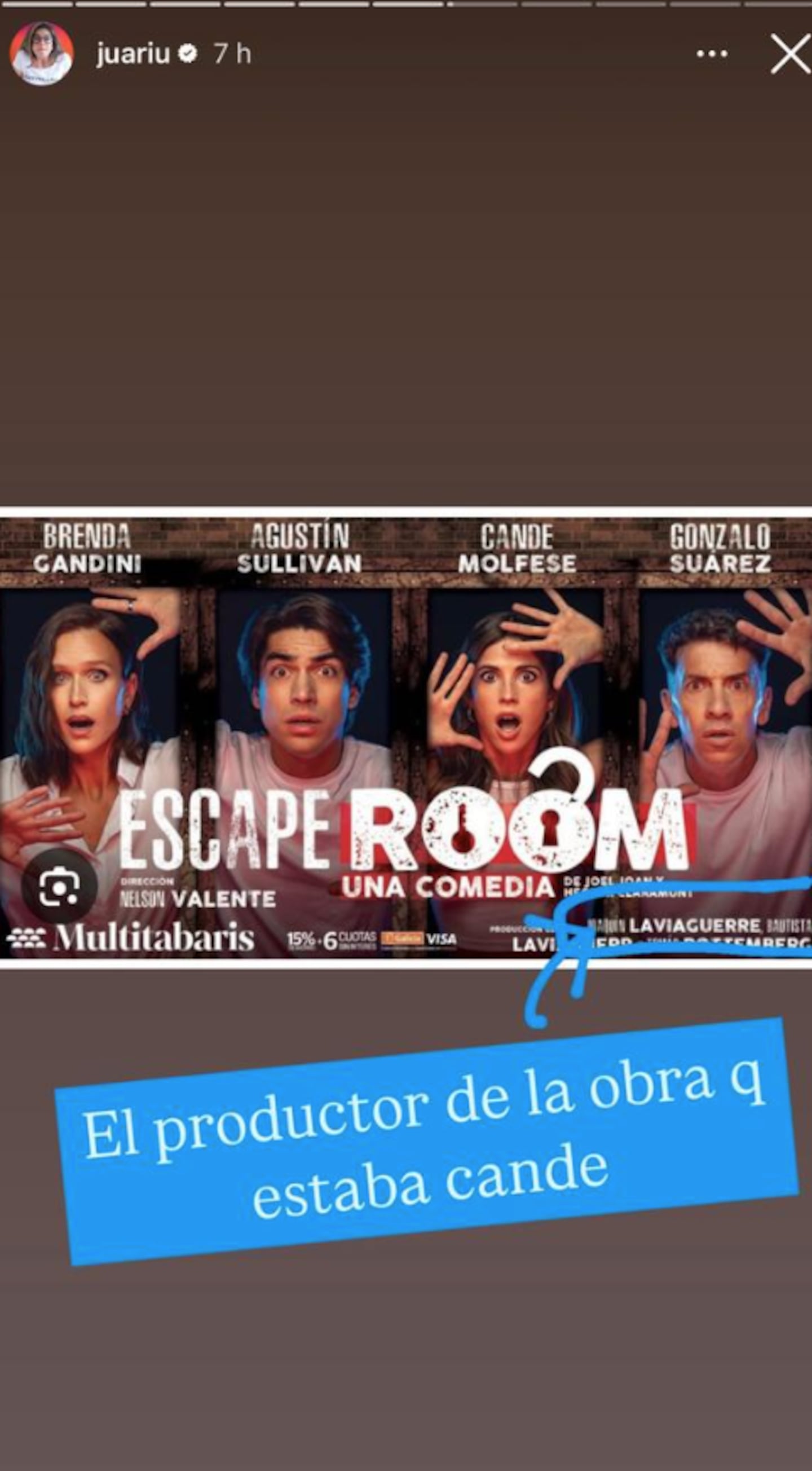 Fue así como entró a fondo en la investigación e incluso llegó a dar con quien sería este nuevo amor. “(Sería) el productor de la obra en la que estaba Cande”, reveló Juariu haciendo alusión a Escape Room.