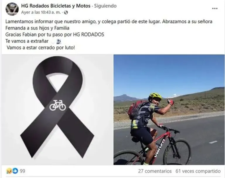 Desde la cuenta de Facebook de la Cochería Fabar informaron que el cuerpo será trasladado a San Carlos de Bariloche para su cremación. “Falleció en nuestra ciudad a la edad de 37 años Tripailaf, Oscar Fabián, más conocido como El Faby de HG”, expresaron en el mensaje de despedida. Las redes se llenaron de mensajes de afecto y condolencias hacia su esposa, sus hijos y el resto de la familia.