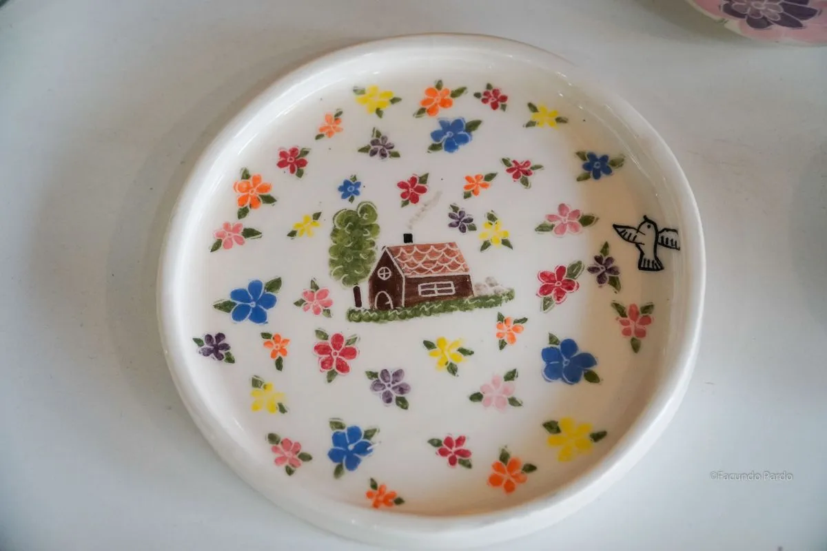 Realiza piezas utilitarias, algunas por completo a mano, otras con moldería, y la totalidad pintada a mano. “Siempre con referencias a la naturaleza de Bariloche, por eso suelo dibujar aves y flores”, expresa Cary.