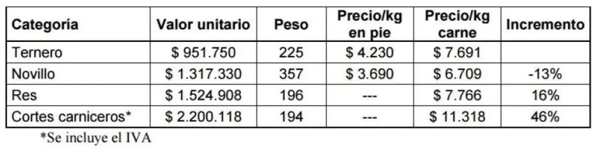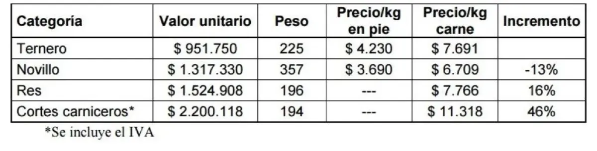 Un error común, según el análisis, es comparar directamente el precio del novillo en pie con el de la media res. Se debe tener en cuenta el rendimiento carnicero, que ronda el 55%. Así, el precio del novillo por kilo de carne pasa de $3.690 en pie a $6.709 en la res, lo que representa un incremento real del 16%. El mayor salto se produce en la etapa minorista, donde se aplica un adicional del 32% que, sumado al IVA, se transforma en un 46% de incremento desde la res al corte final.