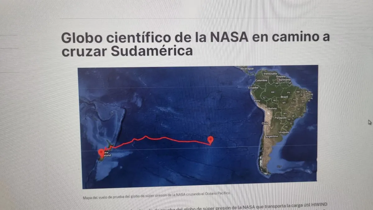La información que proporcionó Daniel Chiesa de Astropatagonia explica que el globo científico, del tamaño de un estadio y de gran capacidad de carga, que se lanzó desde Wanaka, Nueva Zelanda, el 16 de abril (hora del Este de EE.UU.), pasará sobre Chile y Argentina mientras continúa su viaje alrededor del mundo por las latitudes medias del hemisferio sur.