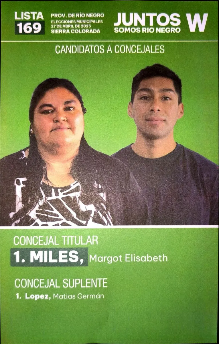 Juntos Somos Río Negro, en tanto, con la lista 169, ofrece como alternativa titular a Margot Elisabeth Miles y a Matías Germán López como suplente.