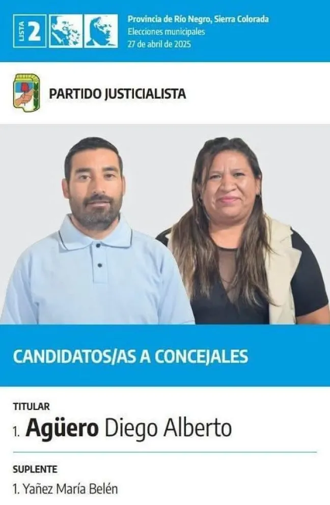 Por el lado del justicialismo, la boleta que lleva el número 2 muestra a Diego Alberto Agüero como candidato titular, mientras que María Belén Yañez va como suplente.