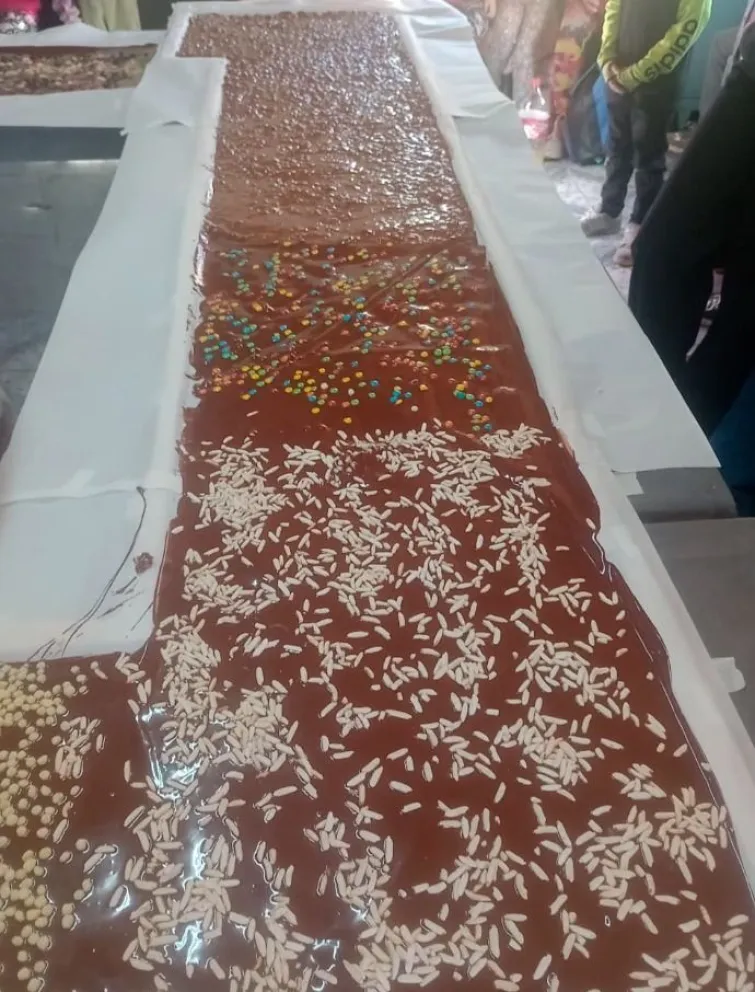 Elaboraron una barra de 12 metros y más de 50 centímetros de ancho. Delante de los invitados fueron tirando el chocolate, los cereales y esperaron el momento del corte y reparto en las bandejas.