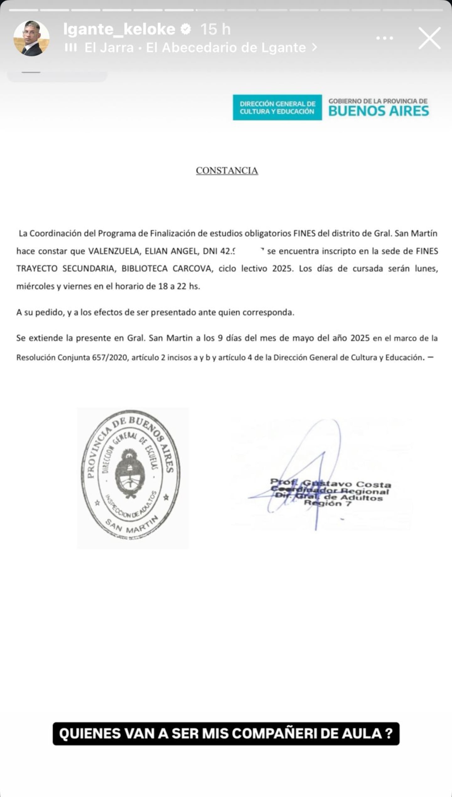 En la publicación que compartió, mostró la constancia para dar fe de este paso en su carrera: “La Coordinación del Programa de Finalización de estudios obligatorios FINES del distrito de Gral. San Martin hace constar que Valenzuela, Elian Angel, se encuentra inscripto en la sede de FinEs Trayecto Secundaria, Biblioteca Carcova, ciclo lectivo 2025”.