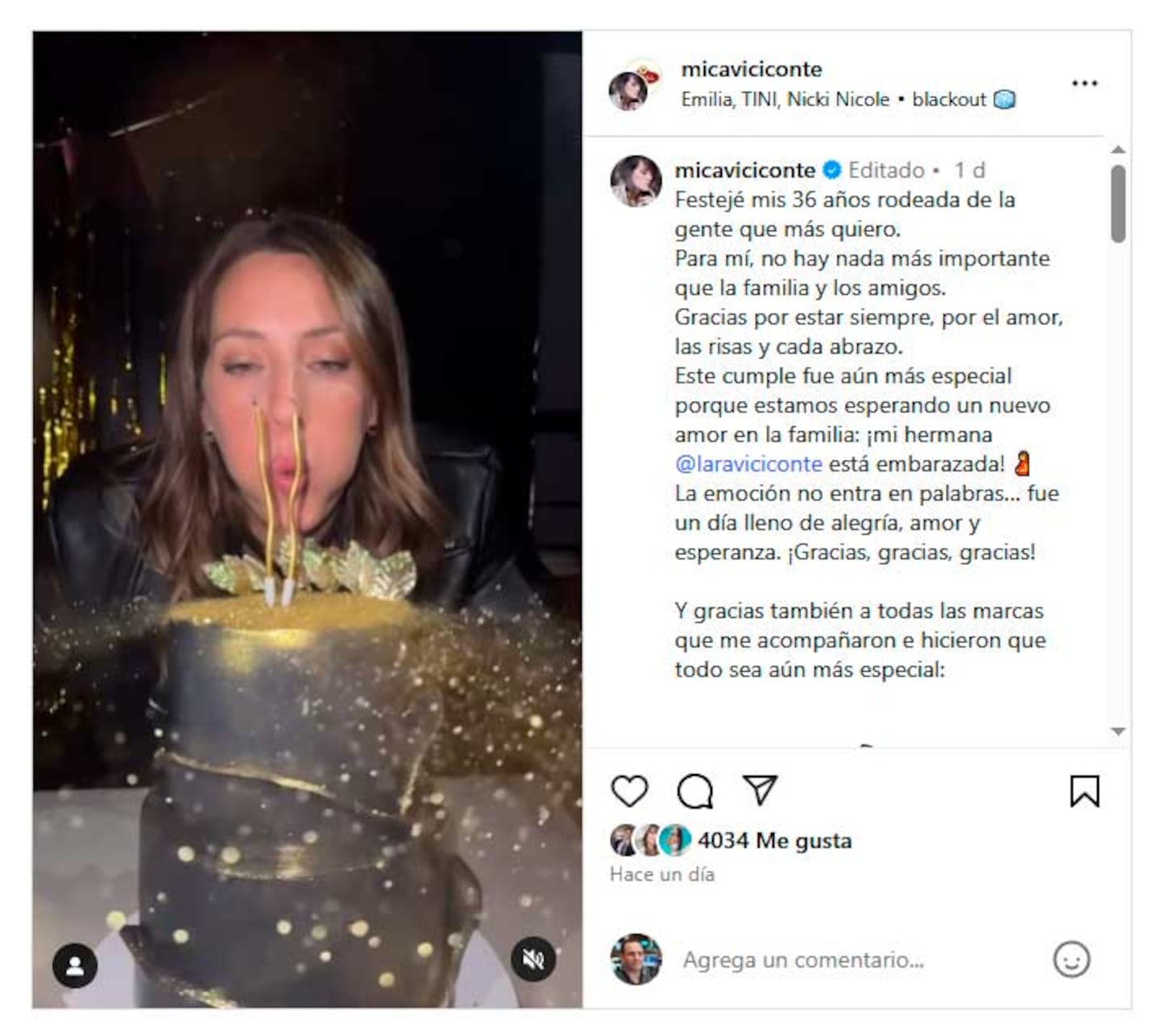 Pero el mensaje más tierno llegó después, cuando confirmó la dulce noticia: "Este cumple fue aún más especial porque estamos esperando un nuevo amor en la familia: ¡mi hermana @laraviciconte está embarazada! La emoción no entra en palabras… fue un día lleno de alegría, amor y esperanza. ¡Gracias, gracias, gracias!", expresó Viciconte.