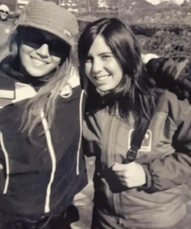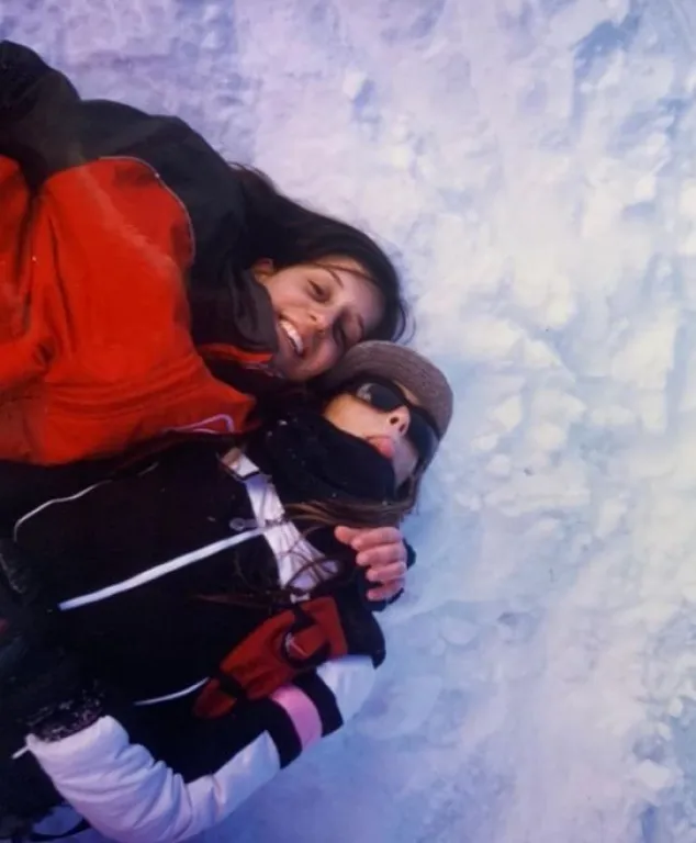 En otra imagen, tomada en la nieve, Luisana aparece acostada sobre el blanco paisaje barilochense, abrazada a una amiga y con atuendos bien de la época: camperas de ski, gorros de lana y anteojos envolventes. Las sonrisas congeladas en la foto transmiten la alegría genuina de esos días de aventura adolescente.