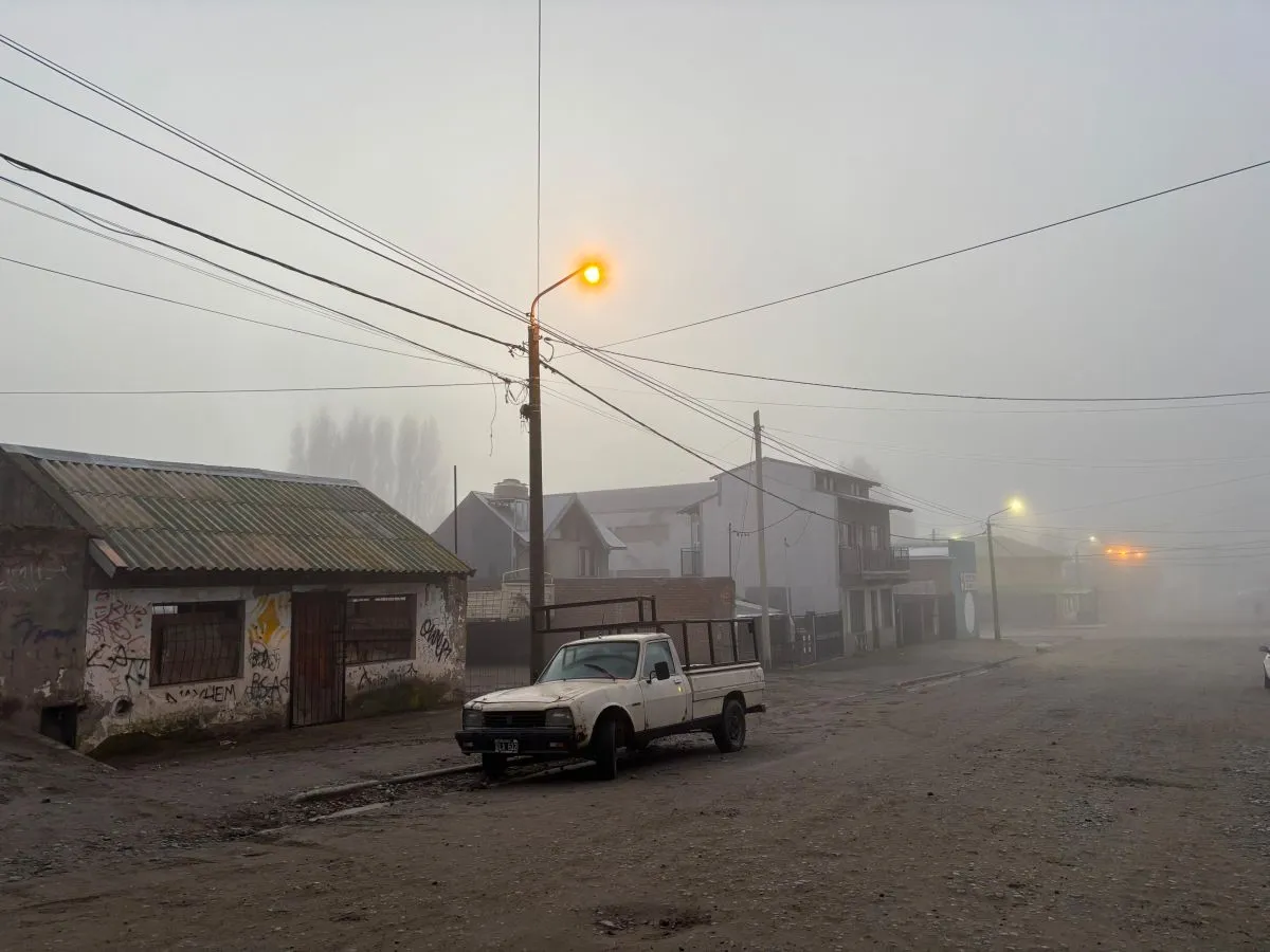 Hoy jueves 29 de mayo, la temperatura mínima fue de -1,7º y alrededor de las 8 de la mañana, una capa de niebla comenzó a ocultar los cerros que rodean a la ciudad. Hay sectores donde los bancos son muy acentuados.