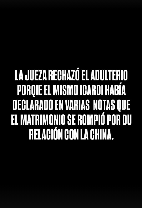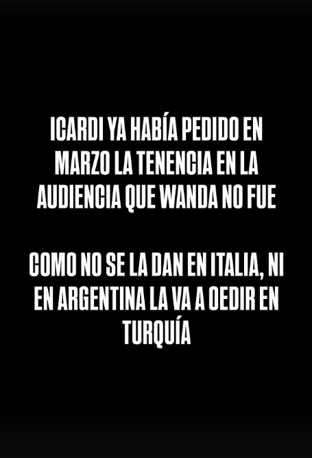 Para darle contexto, el conductor relató: “Icardi ya había pedido en marzo la tenencia en la audiencia que Wanda no fue. Como no se la dan en Italia ni en la Argentina, la va a pedir en Turquía”. Y siguió: La jueza rechazó el adulterio porque el mismo Icardi había declarado en varias notas que su matrimonio se rompió por su relación con la China”.