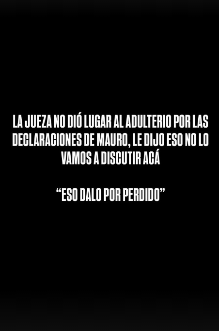 “La jueza no dio lugar al adulterio por las declaraciones de Mauro. Le dijo: Eso no lo vamos a discutir acá. Eso dalo por perdido”, indicó, haciendo alusión a que no podrá contar con una de sus mejores armas, que era el material que tenía de su ex con Keita Baldé teniendo un affaire en su casa.