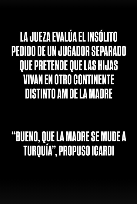 Fue así como resaltó que la principal polémica es el pedido del jugador: “La jueza evalúa el insólito pedido de un jugador separado, que pretende que las hijas vivan en otro continente distinto al de la madre. Bueno, que la madre se mude a Turquía, propuso Icardi”.